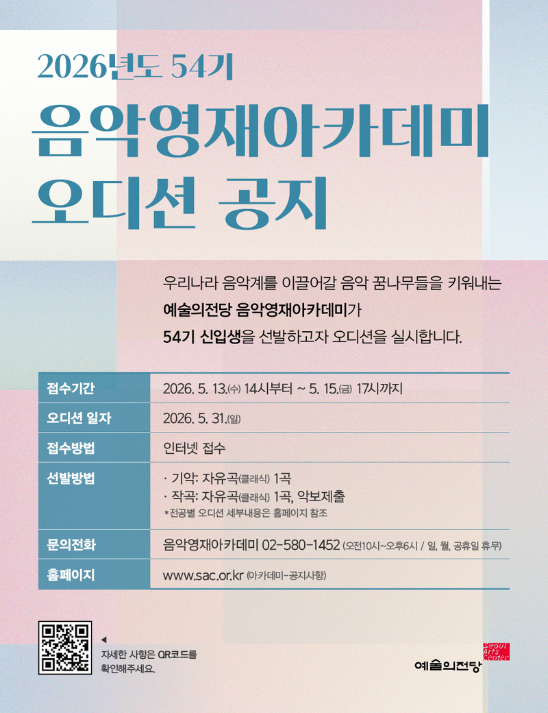 자세한 내용은 예술의전당 음악영재아카데미(02-580-1452)에 문의하면 된다.