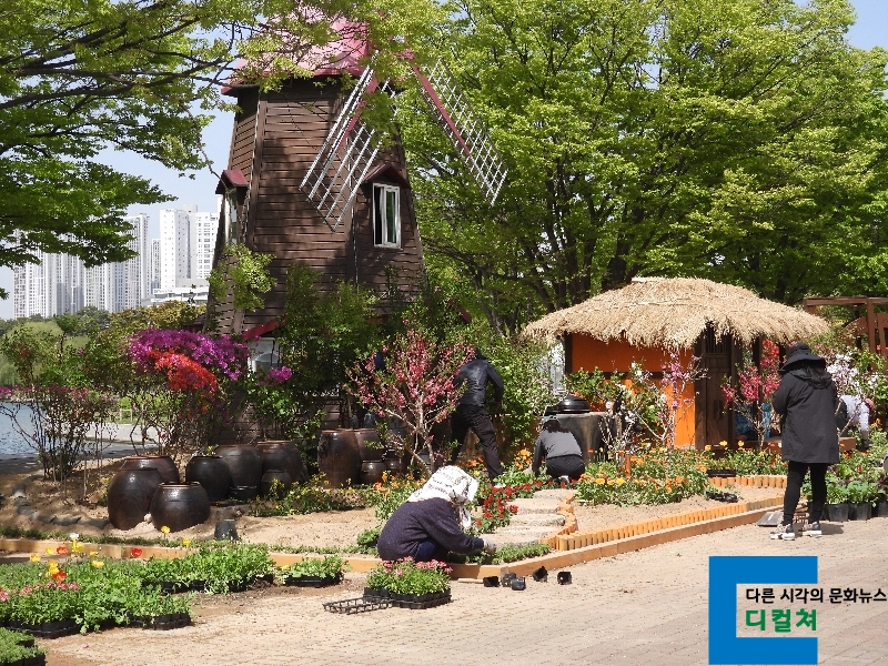 ▲ 풍차 주위에 조경 중인 노동자들 © 이경헌 기자